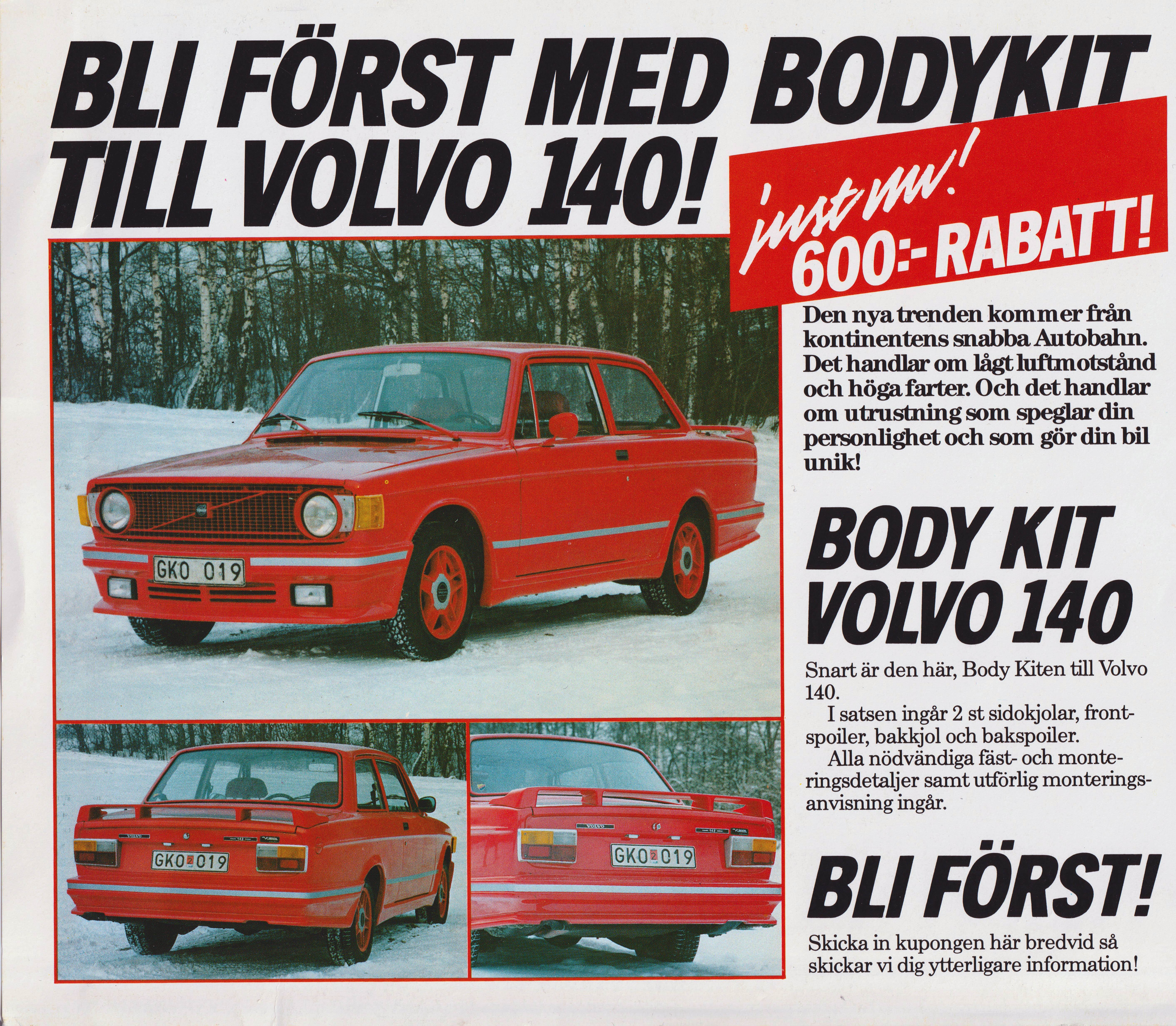 Volvos tillbehörsbroschyrer hade länge något snusförnuftigt över sig. Bogserlinor, kupévärmare och kanske en radio fanns i de tunna publikationerna. Något som bara de som hade både hängslen och livrem kunde bli upphetsade över. Undantaget på 1970-talet var Volvos R-Sport som marknadsförde trimprylar. Men på 1980-talet handlade det inte längre om att få bilen att gå fortare utan om att få bilen att se ut som att den gick fortare. Samtidigt så svällde tillbehörsprogrammet till att omfatta mängder med nya prylar och broschyrerna blev betydligt tjockare. ”Den nya trenden kommer från kontinentens snabba Autobahn. Det handlar om lågt luftmotstånd och höga farter” skrev Volvobil i broschyrbladet för bodykitet till Volvo 142. Till 1980-talets Volvomodeller som 240 och 740 fanns förstås motsvarande bodykit.