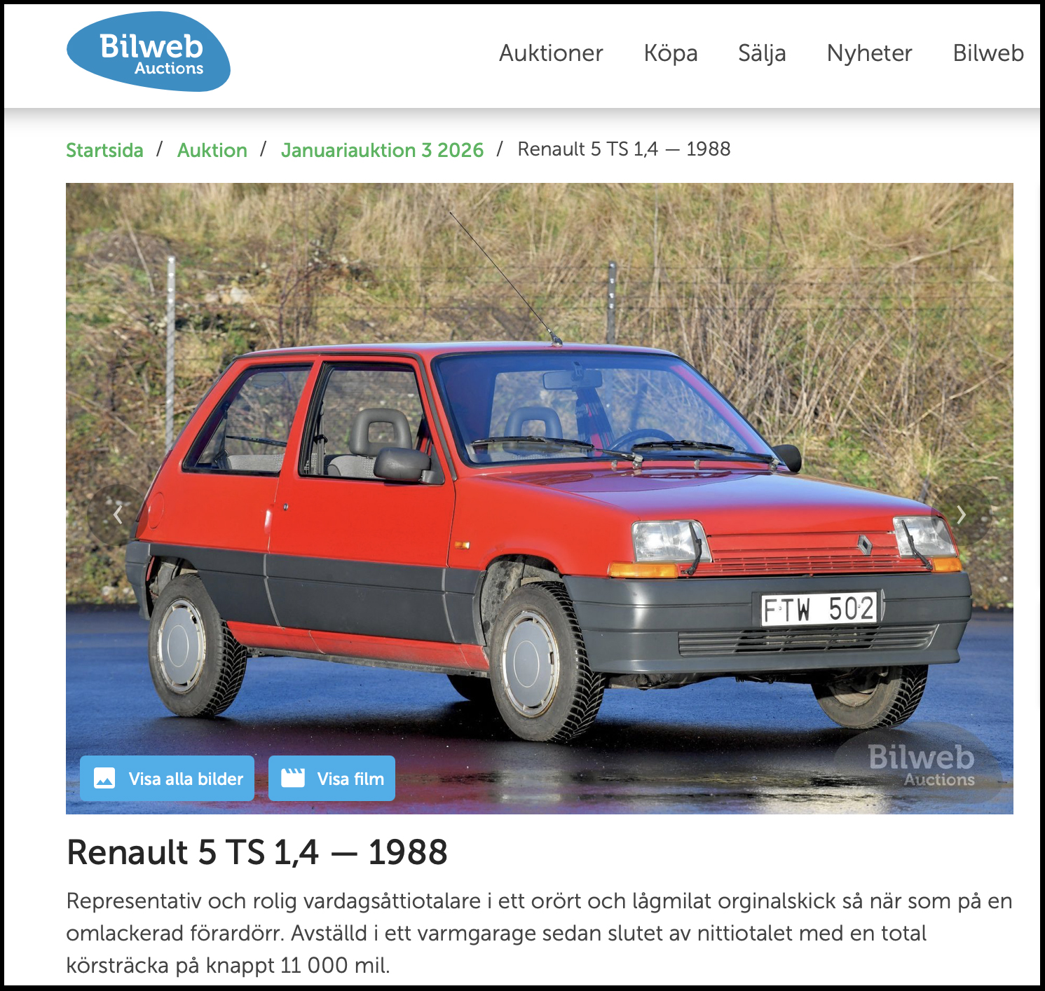 Auktionsbilderna på en Renault 5 TS 1988 talade till mig direkt direkt. Jag gillar småbilar och det behöver inte vara flådiga sportversioner. Renault Super 5 är extra snygg i sina grundversion med stora gråsvarta plastsjok på karossidorna och stötfångare i samma kulör. Det var i slutet av januari som bilen var till salu hos Bilweb Auctions. Jag bläddrade runt bland bilderna på auktionsobjektet och oftast brukar det då till slut dyka upp någon bild som visar en skada som gör att jag kan släppa tanken på att lägga ett bud. Men inte den här gången. ”Representativ och rolig vardagsåttiotalare i ett orört och lågmilat originalskick så när som på en omlackerad förardörr” skrev Peter Sundfeldt i auktionsbeskrivningen.