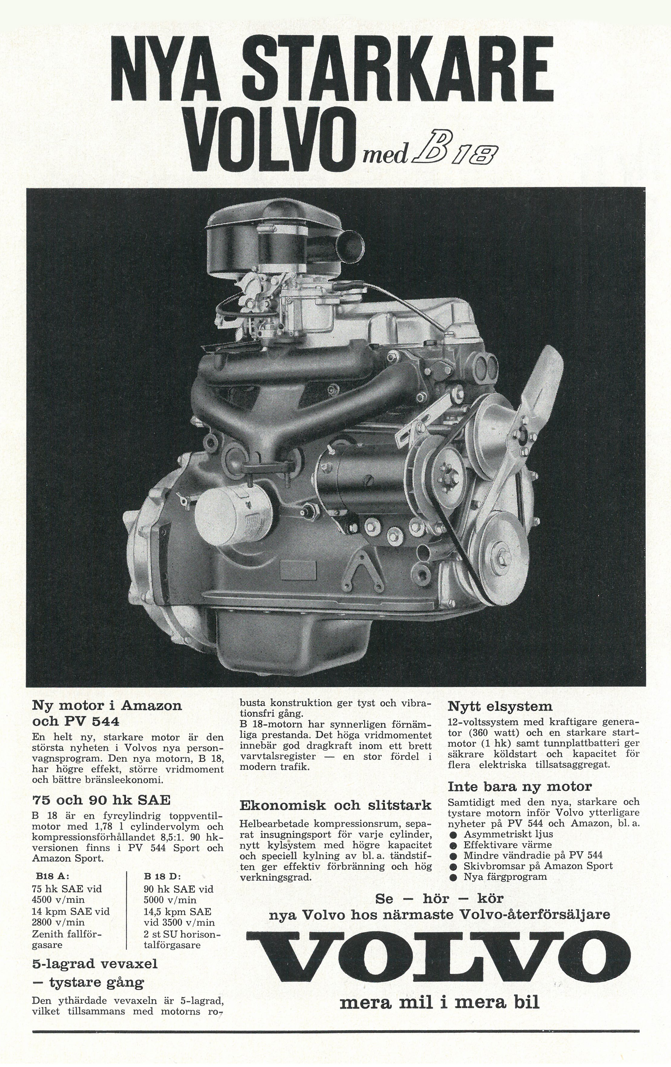 Volvo Amazon lanserades med B16-motorn, fick sedan B18 och på sluttampen B20. Kolla in den här sköna reklamfilmen för Amazon med B18!