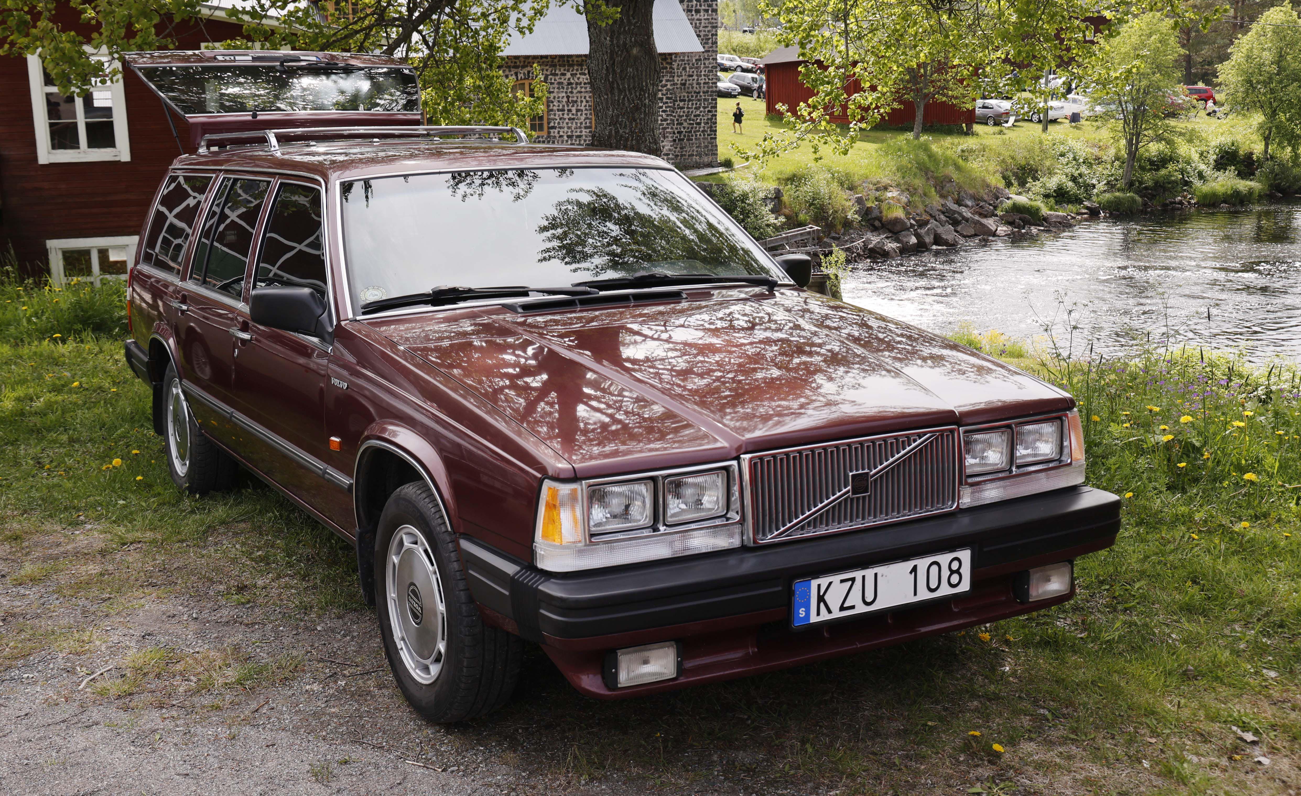 Svensksåld Volvo 740 herrgårdsvagn 1988 som gör sig bra med USA-specifikation som dubbla kvadratiska strålkastare och ett typiskt tillbehör i form av takrails.