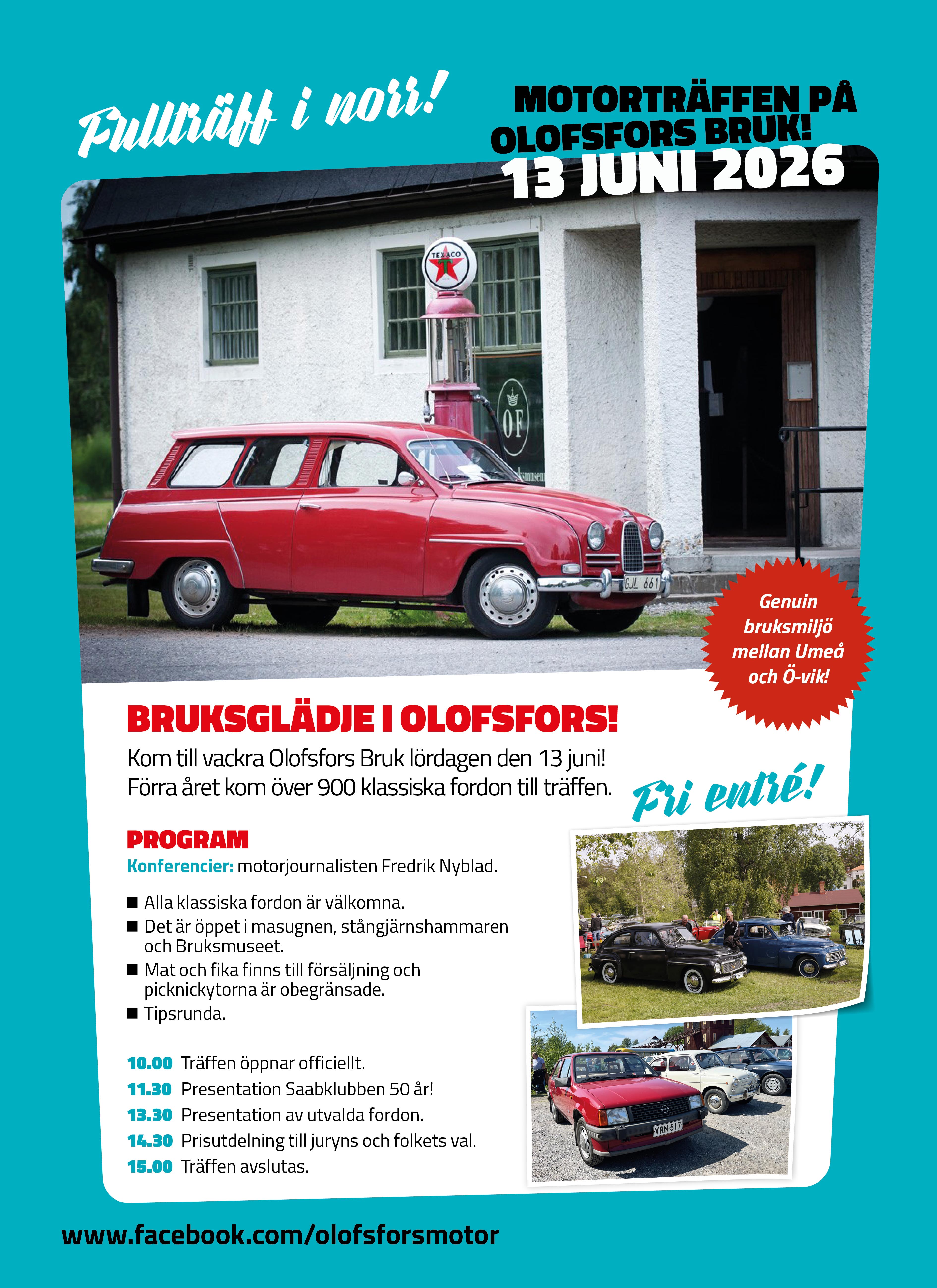 Olofsfors ligger mellan Umeå och Örnsköldsvik. Träffen i år 2026 hålls lördagen den 13 juni. Jag, Fredrik Nyblad kommer som tidigare år att vara konferencier och är även på plats för att sälja böcker, modellbilar och mycket annat. Bland höjdpunkterna 2026 kommer Saabklubbens 50-årsjubileum vara. Välkommen till Olofsfors i sommar – jag ser redan fram emot träffen!