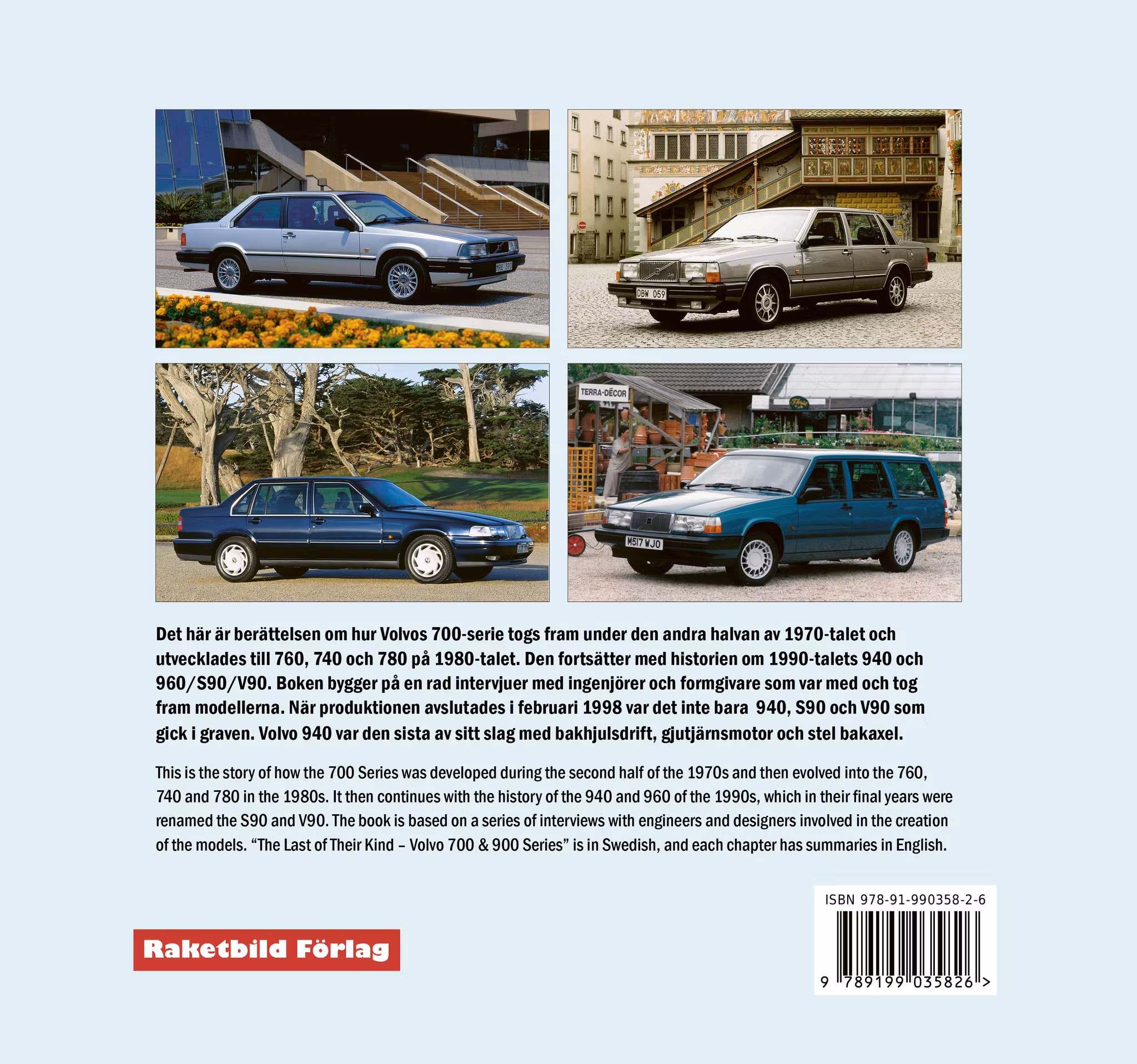 När produktionen avslutades i februari 1998 var det inte bara modellerna 940, S90 och V90 som gick i graven. Med Volvo 940 hade också den sista bakhjulsdrivna bilen från Göteborg med gjutjärnsmotor och stel bakaxel tillverkats. ”De sista av sitt slag – Volvo 760, 740, 780, 940 och 960” är på 144 sidor och är på svenska med sammanfattningar av varje kapitel på engelska.