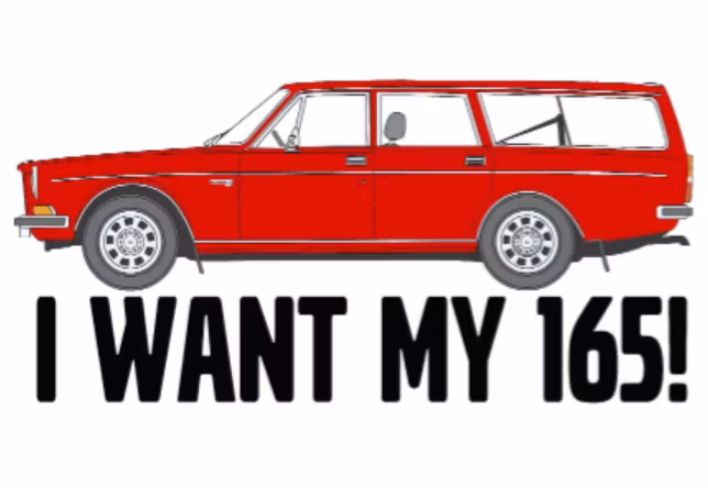 Klistermärke med en Volvo 165 - herrgårdsvagnsversionen av 164 som Volvo aldrig tillverkade men som ändå finns! Tryckt på vit plast, 10,5 cm bred och 7,4 cm hög. Framtagen av Raketbild Förlag i en begränsad serie.