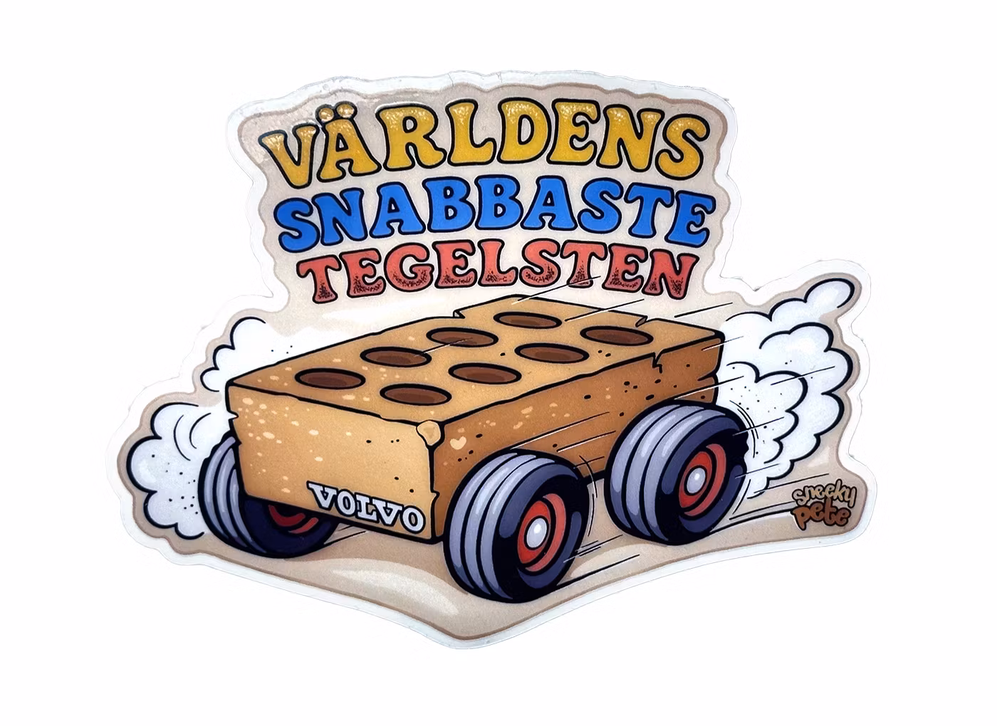 Klistermärke från Sneeky. Världens snabbaste tegelsten kallades Volvo 240 Turbo när den tävlade på 1980-talet men omdömet har nog delats ut även till andra Volvomodeller från samma tid som Volvo 740 och Volvo 850. Liknar en vattendekal; dekalen är tryckt på transparent vinyl (inga vita kanter). Mått: 10 x 8 cm.