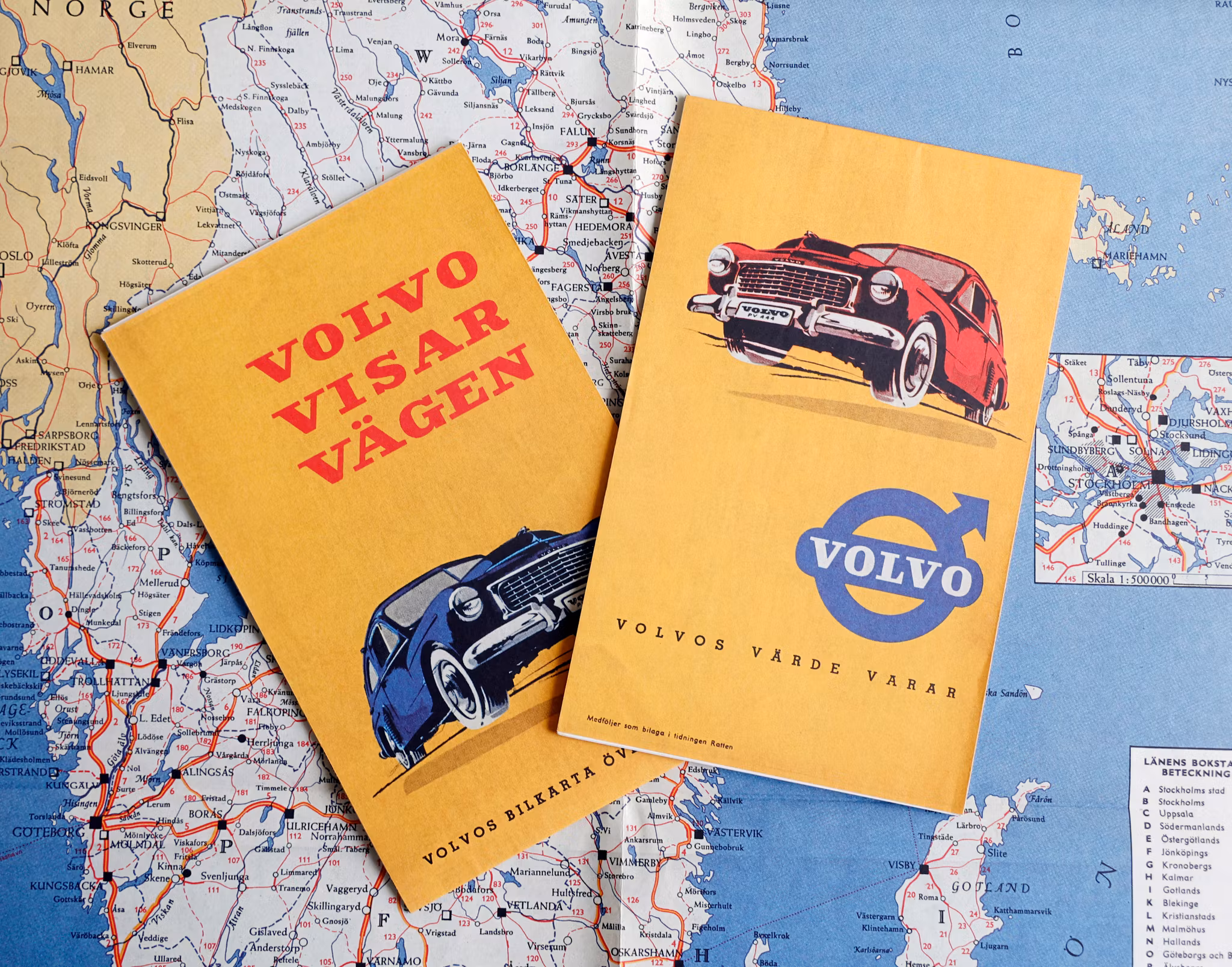 Nytryckt Sverigekarta som ursprungligen medföljde som bilaga till Volvos kundtidning Ratten. På omslaget syns Volvo PV 444.