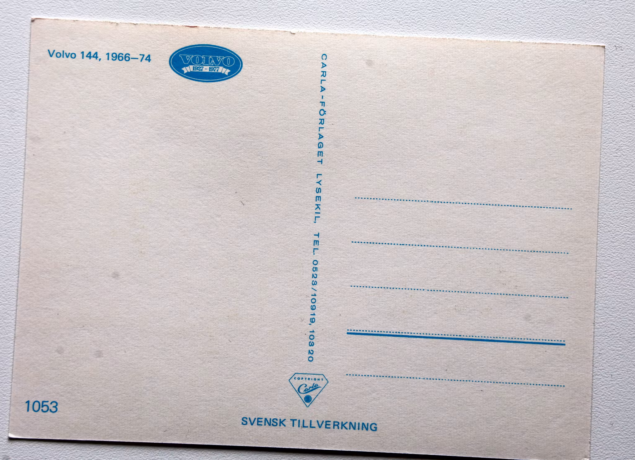 Vykort tryckt i samband med Volvos 50-årsjubileum 1977. Alltså gammalt men oanvänt och i gott skick. Mått: 15x10 cm.